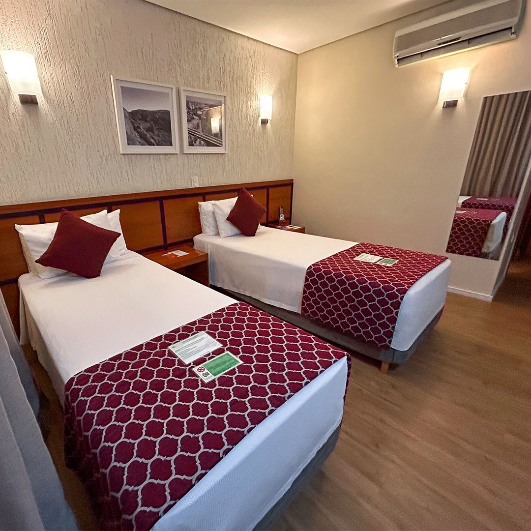 Seja você um viajante individual ou acompanhado, oferecemos flexibilidade nas configurações dos quartos, que podem contar com uma cama de casal ou duas camas de solteiro, garantindo uma noite de descanso revigorante. A alteração das camas é feita sem custo adicional, assegurando que cada detalhe atenda aos mais altos padrões de conforto e qualidade, refletindo nosso compromisso com a excelência.