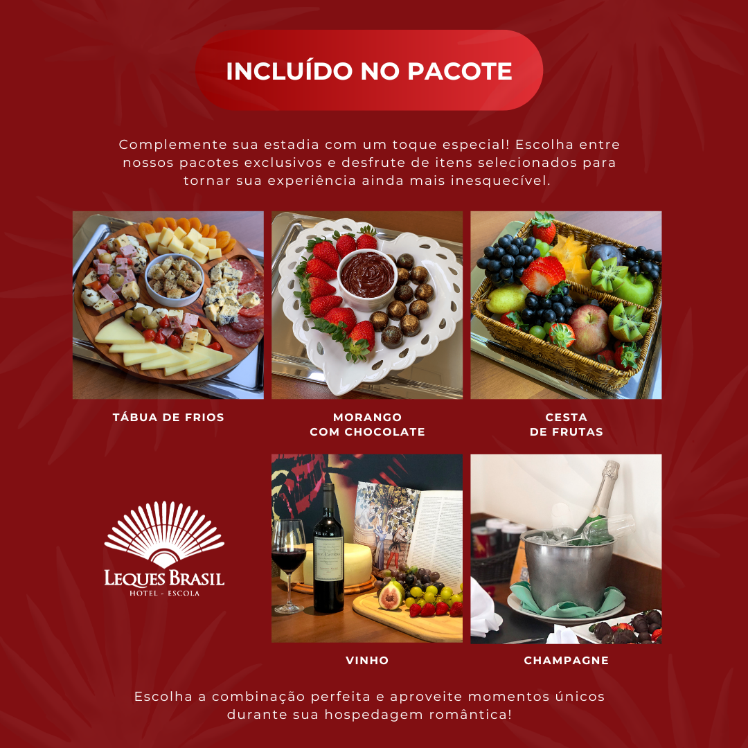 Com um enxoval especial, pétalas de rosas, um buquê encantador e um cartão de boas-vindas, cada detalhe reflete cuidado e carinho. Viva sua noite especial com conforto e elegância, em um cenário perfeito para criar memórias que durarão para sempre.