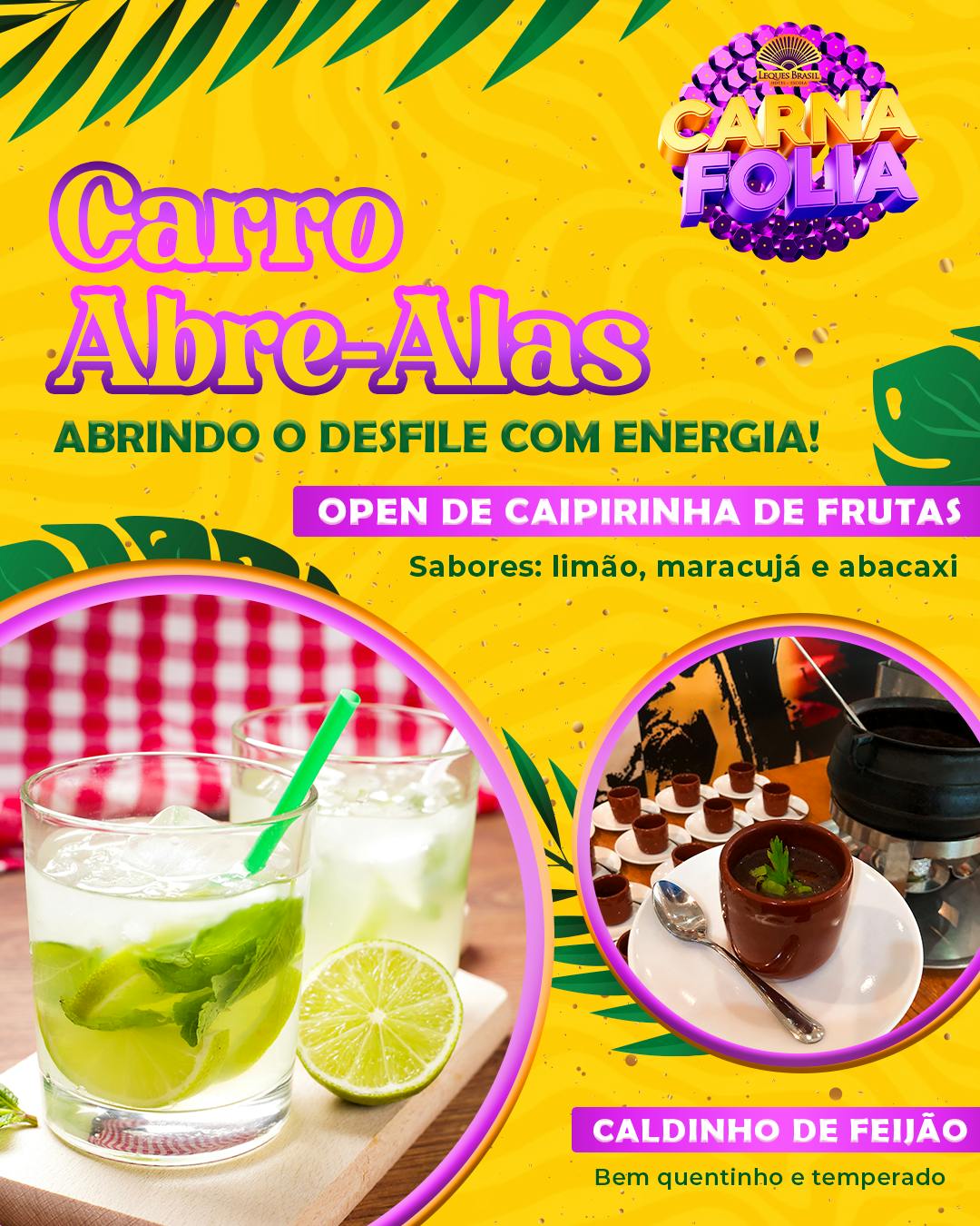 Carro Abre-Alas: caldinho de feijão bem quentinho e open de caipirinha de frutas (limão, maracujá e abacaxi), porque toda grande celebração começa no ritmo certo!