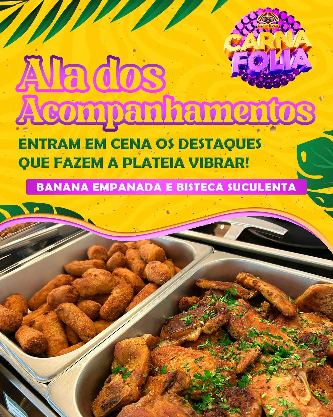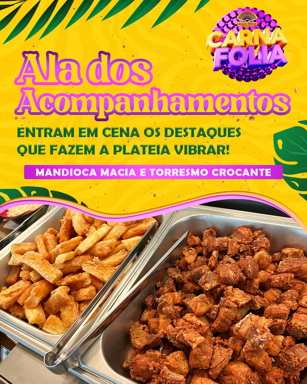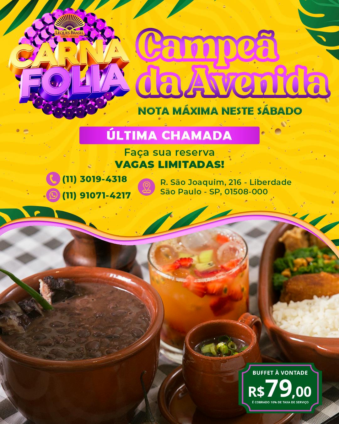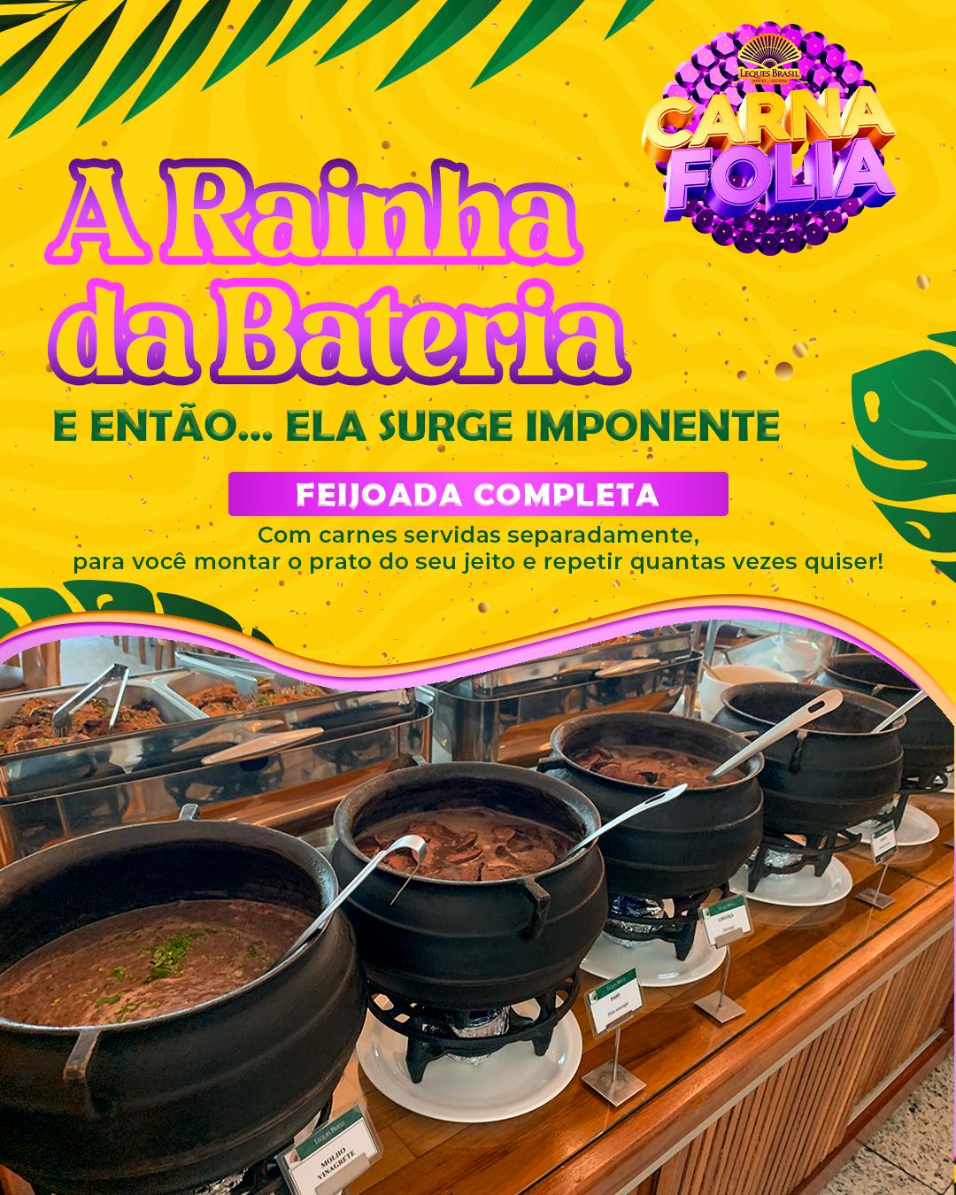 Rainha da Bateria: a Feijoada Completa surge imponente, com carnes servidas separadamente para você montar como preferir e repetir à vontade. Buffet livre por R$79,00. Aqui, quem comanda o compasso é você.