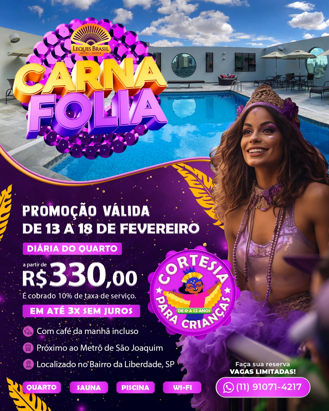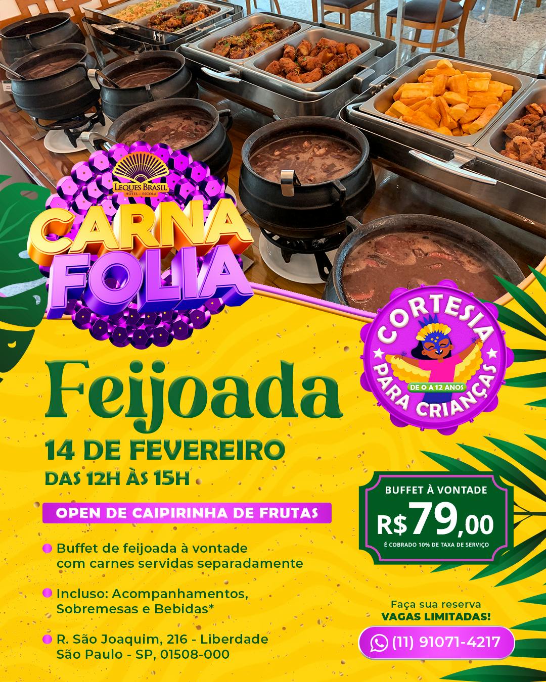 PARE O BLOCO: Sábado de Carnaval tem Feijoada Completa por R$79,00 no Hotel Leques Brasil.