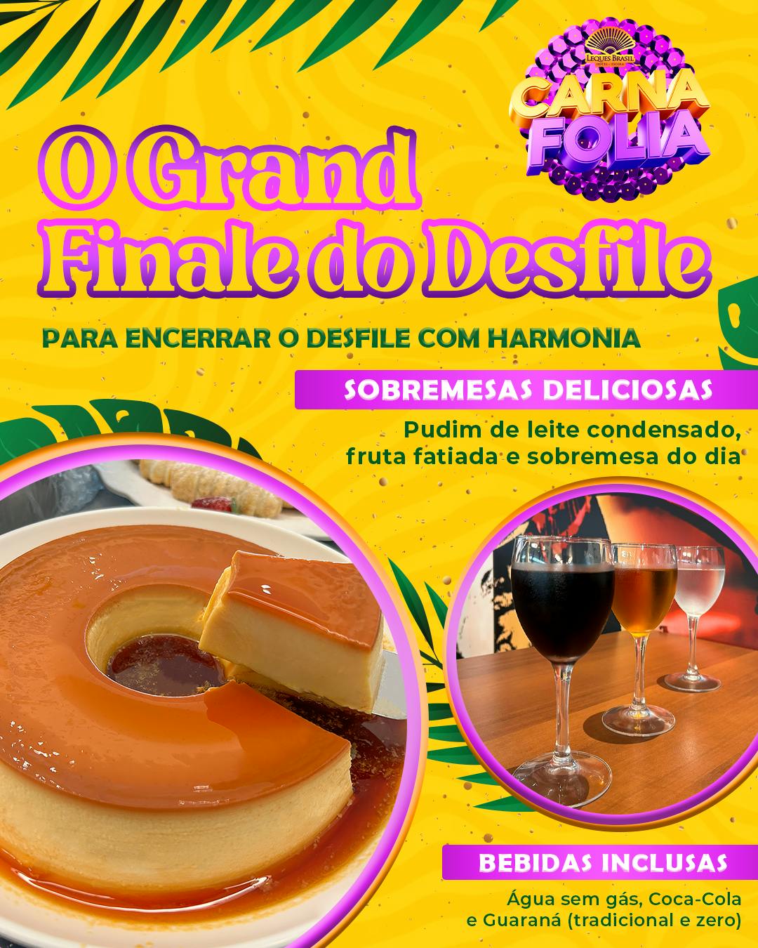 Grande Final da Avenida: pudim de leite condensado, frutas fatiadas e sobremesa do dia. Bebidas inclusas servidas em jarra: água sem gás, Coca-Cola e Guaraná (tradicional e zero).